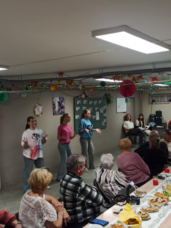 Wolontariusze złożyli seniorom życzenia oraz przekazali pamiątkowe mydełka wykonane podczas lekcji chemii. W czasie wspólnego świętowania Seniorzy oraz zaproszony gość obejrzeli występ artystyczny przygotowany przez uczniów naszej szkoły, który został zakończony wspólnym tańcem – belgijką.