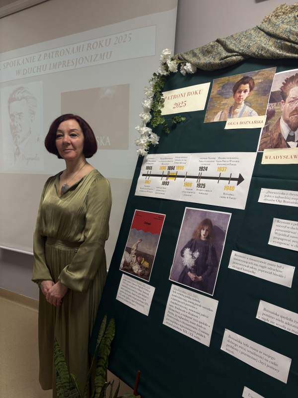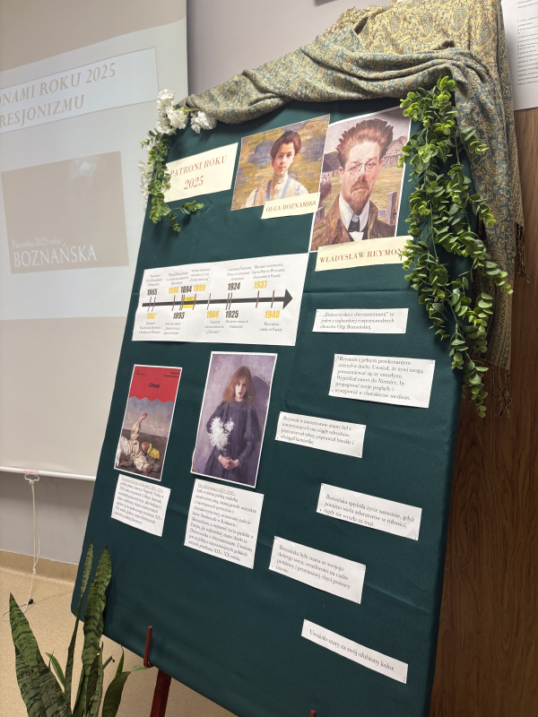 W ramach corocznej edycji lekcji otwartej odbyło się W DUCHU IMPRESJONIZMU, bowiem uczciliśmy młodopolskich artystów: Władysława Reymonta i Olgę Boznańską. Pomysł na lekcję to kolaż kontekstów działających na wszelkie ludzkie sensory, bo ( zgodnie z ideą synestezji ) okiem podziwialiśmy piękno obrazów malarskich Boznańskiej, wsłuchiwaliśmy się w modernistyczną muzykę Debussy’ego, dotykaliśmy intelektualnie reymontowskich opisów lipieckiej wsi, poszukując impresjonistycznych akcentów, zmysłem powonienia chłonęliśmy zapachy pól i łąk wykreowanych ręką powieściopisarza i malarzy.